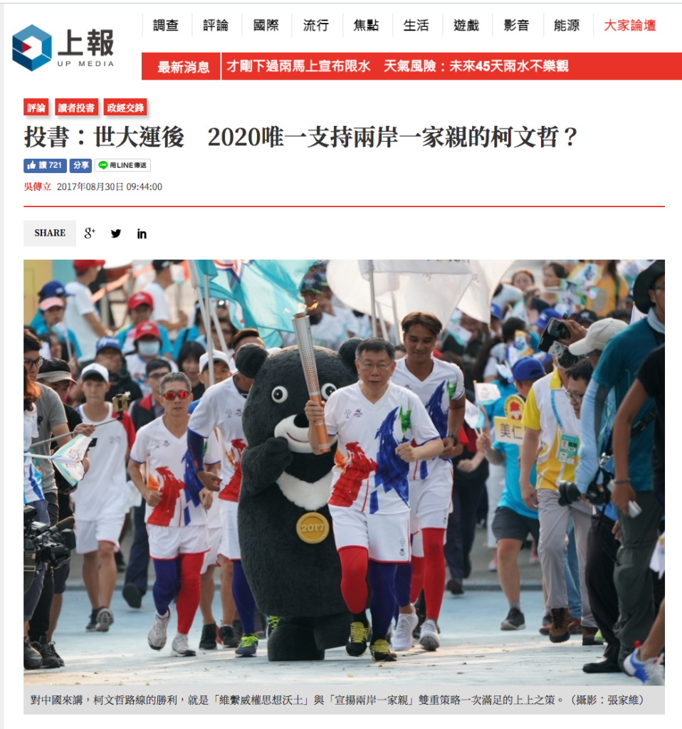 總之,在世大運閉幕式呈現中華民國國旗,當然有利於中國民國情感的凝聚;而凝聚情感的首要功臣,是主辦世大運的白色力量柯市長,而且實際上無損於中國對於柯市長的評價、無礙於下一場台北與上海的雙城論壇!如此對內凝聚中華民國感情、對中維繫兩岸和平關係的柯市長,自是2020總統大位的不二人選。如此策略,不亦妙哉?