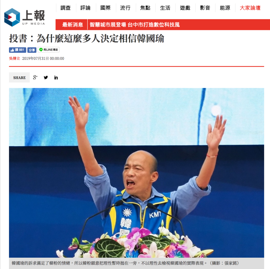 簡單的說,就是:韓國瑜的訴求滿足了韓粉的情緒,所以韓粉願意把理性暫時拋在一旁,不以理性去檢視韓國瑜的實際表現。