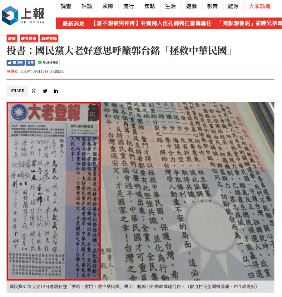 更別說,中國國民黨長期縱容退休將領到中國朝見「祖國」,就連前副總統蕭萬長率隊去中國面見習近平、聽習近平說「祖國統一大業」也不改微笑老蕭的本色、面帶微笑又伏首貼耳毫無異議。而今那些中國國民黨大老們竟然又好意思聯名登報說呼籲郭台銘「唯有團結,才能拯救中華民國,保衛台灣」。