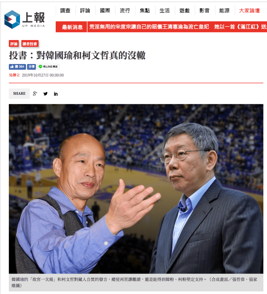 不管是柯文哲對於人權的極端言論、還是韓國瑜關於文物展覽的世紀笑話,一旦被放在國際媒體遭受世人檢視,絕對都是足以引起全球訕笑、鄙夷的大醜聞。但是在台灣,這些言論卻變成「信者恆信,不信者恆不信」、「不要斷章取義」的「不同立場的不同解讀」而已。這難道不是台灣的悲哀?