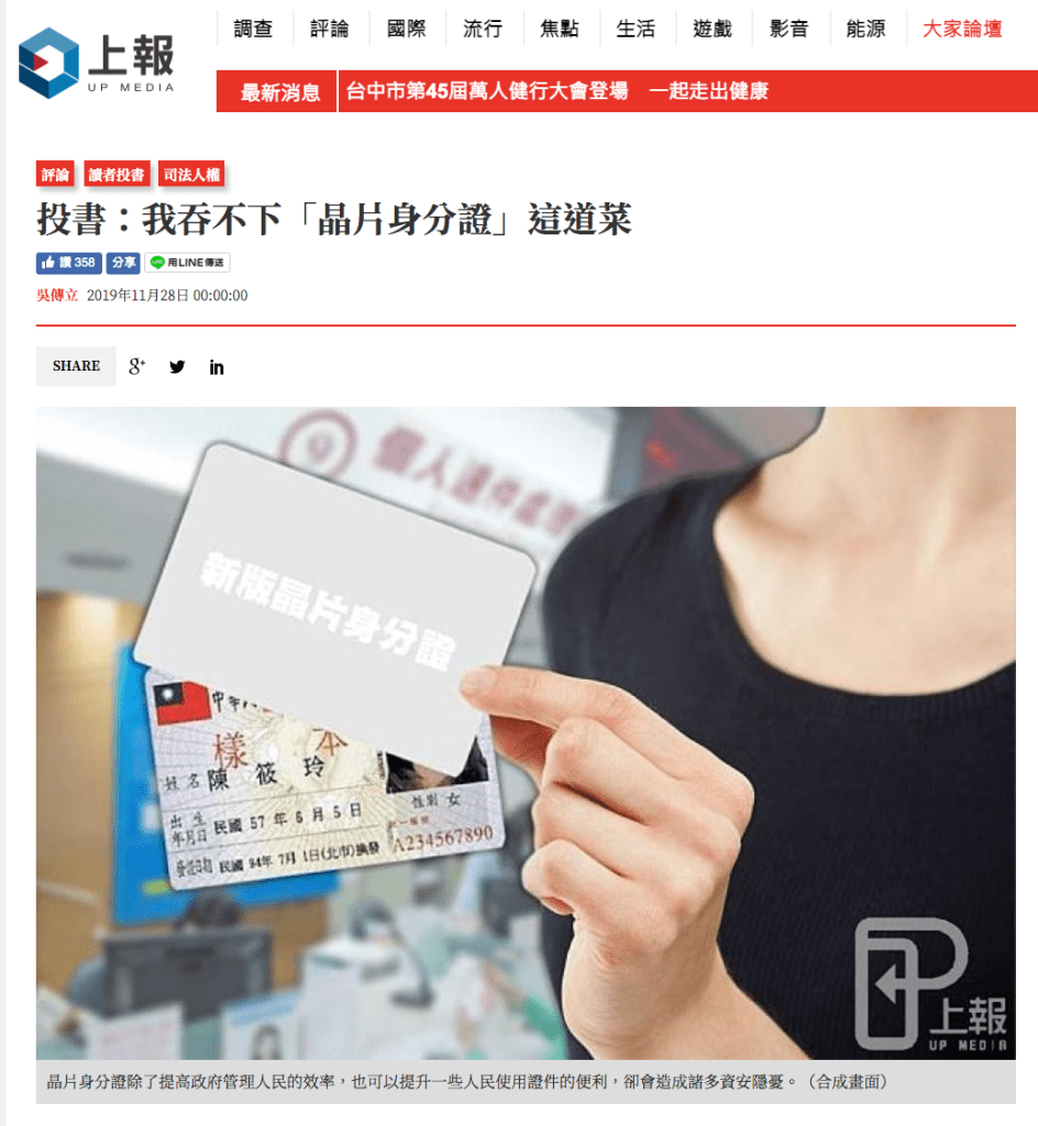 蔡英文政府要推「晶片身分證」,而目前為止,似乎並沒有哪一個政黨跳出來強力反對。所以,與其說是「蔡政府要推」,我覺得更精確地說,應該說是「中華民國政府要推,而且多數人不反對」。