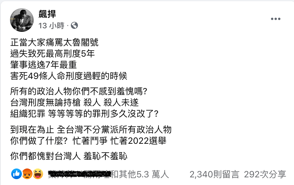 「過失致死最高刑度5年肇事逃逸7年最重 害死49條人命刑度過輕的時候所有的政治人物你們不感到羞愧嗎?台灣刑度無論持槍 殺人 殺人未遂組織犯罪 等等等等的罪刑多久沒改了?」意思是說,關於「過失致死」、「肇事逃逸」、「持槍」、「殺人未遂」、「組織犯罪」這些罪行的最高刑度,都應該「與時俱進」地,每隔幾年就拿出來檢視一下「嗯,最近持槍的人比較多,所以從最高刑度從一年加碼到兩年」、「最近肇事逃逸的人變少了,而且上次那個全國矚目的肇事逃逸案件其實惡行沒有那麼重大,所以我們還是把刑度酌減一下,從三年改成一年就好」、「歐淦淦淦最近有人拿機關槍掃射一口氣打死八個人,幹你娘這種持槍掃射的罪行應該要從一個死刑加碼到五個死刑」。這樣子,是不是就表示台灣的政治人物、尤其是立法委員們才算有在關心台灣的法治啊、人民的安全等等的問題?