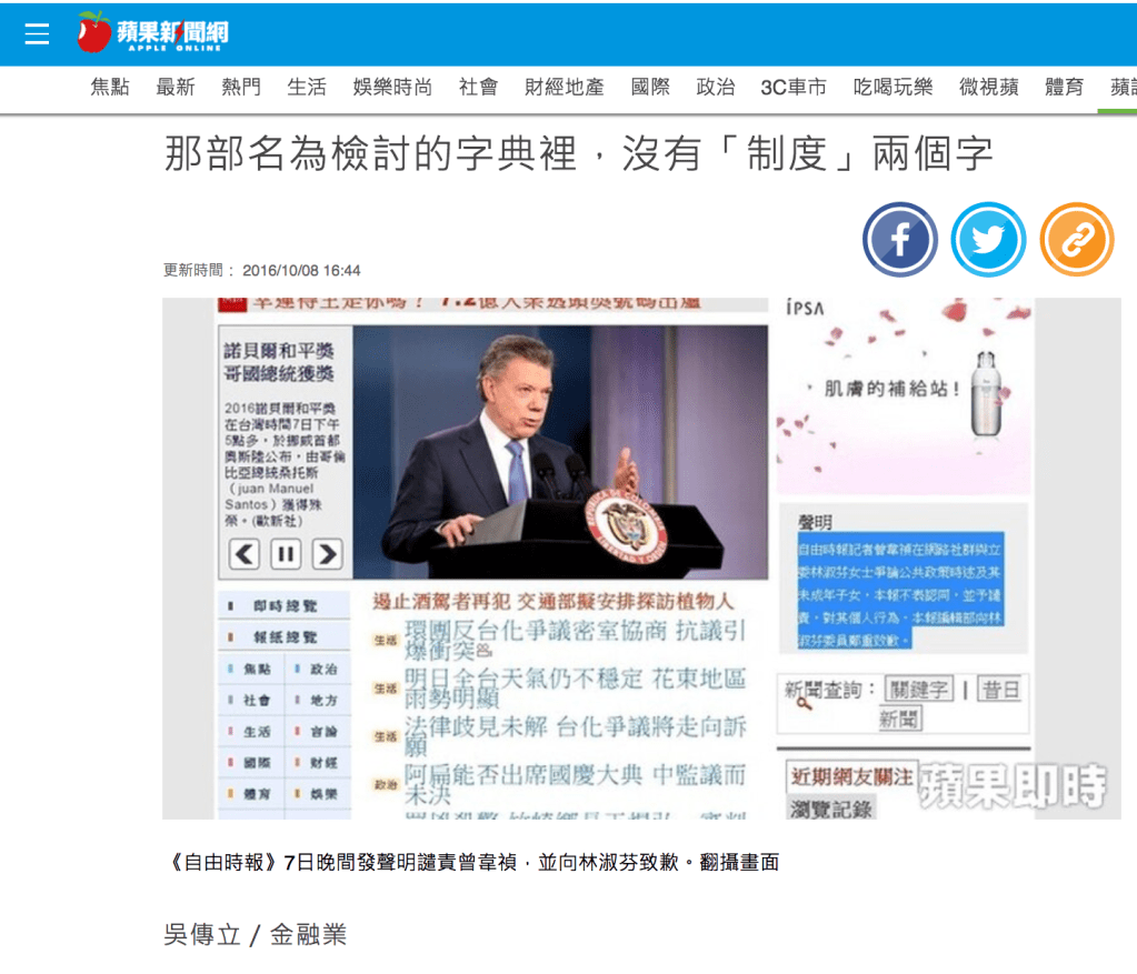 蔡政府上台前誓言推動轉型正義,推著推著竟然推出威權打手的宋楚瑜擔任蔡總統特使,這已經夠令人心寒了;而今,行政院與《自由時報》各自怎麼處理所屬幹出來的好事?新政府是否能夠為中華民國那部名為「檢討」的字典添上「制度」兩個字?全台灣人民都在看!