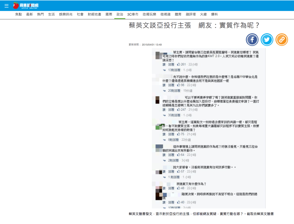 台灣欲申請加入亞投行創始成員國,過程引發爭議,民進黨主席蔡英文昨在臉書表示,他們主張,政府須提出完整方案與評估報告,尋求社會共識,並接受國會完整的監督,「絕不能黑箱決策」。但po文下不少網友留言質疑,民進黨沒有實質作為,網友Sabrina Cheng批民進黨一直打迷糊仗,「可以不要再賣弄字眼了嗎?請民進黨直接面對問題」。