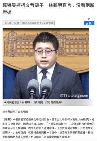 別說是當時的柯粉如何護柯、如何討伐那些質疑了;就連2018年10月葛特曼來台召開記者會說「柯文哲是騙子」時,蔡英文的總統府發言人都出來說「不樂見無端指控」。