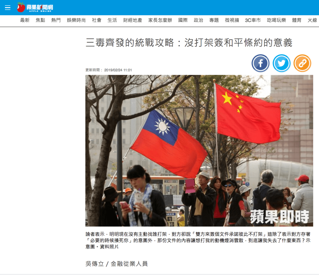 台灣人對於中國各種統戰毫無戒心,甚至還有當紅的政治明星如柯文哲高喊「統戰被污名化」;當全世界圍堵中國的態勢逐漸成形、時間拖越久對中國越不利的時候,台灣的中國國民黨公開主張一旦取得執政權將盡快簽署兩岸和平協議,那個承認將台灣主權只是「中國內政問題」的和平協議。