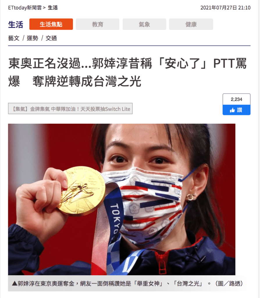 一堆台派獨派,即便當初大聲疾呼「東奧正名」之必要的那些人,但是對於「當初用力反對東奧正名,如今獎牌加身、運動場上戰功彪炳」的選手,依舊用一種眼睛冒愛心泡泡的姿態讚美崇拜著。其實可以有幾種不同的讚美的角度。
