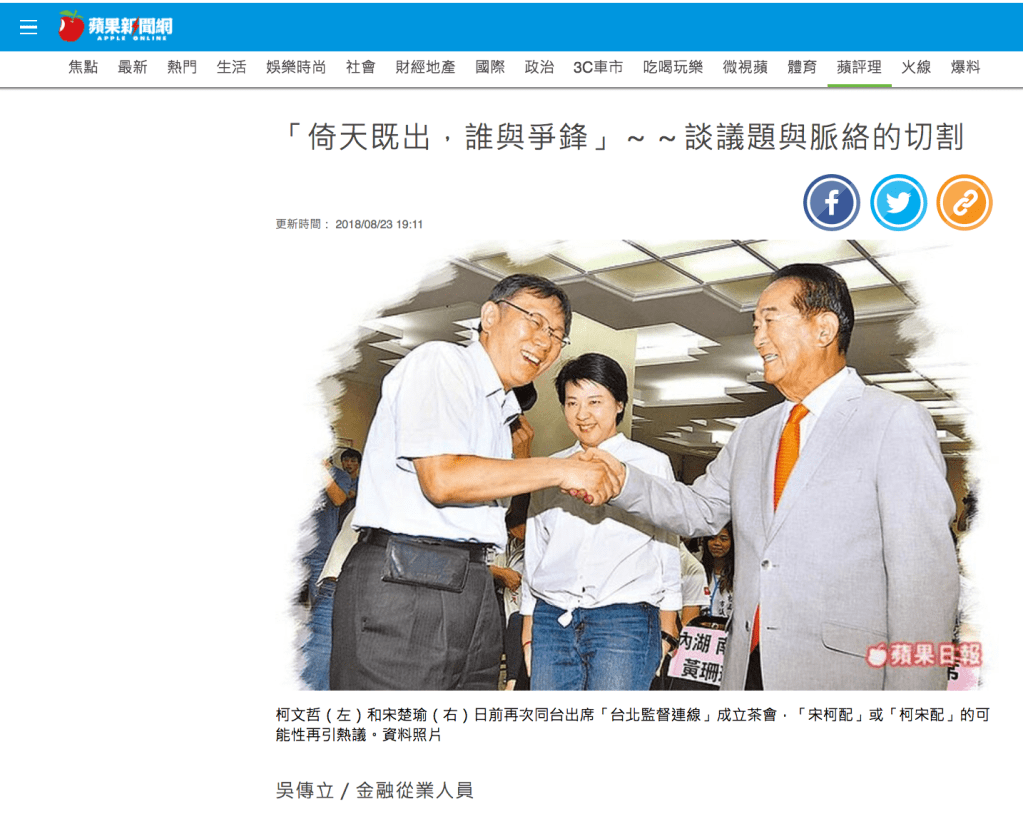 但次元刀的厲害在於不僅能橫向地切割左右議題,還能縱向地切割前後脈絡。比如說,十八年前的柯文哲說「我對張昭雄充滿敬佩的感覺。因此當看到電視上,張昭雄站在宋楚瑜身邊,內心的震驚無法形容」,十多年後的柯文哲卻對主張終極統一的宋楚瑜握手哈腰;四年前第一次參選的時候就找了親中統派議員組什麼首都大聯盟,第二次競選連任的今天更堂而皇之直接找了主張終極統一的宋楚瑜「連線」。