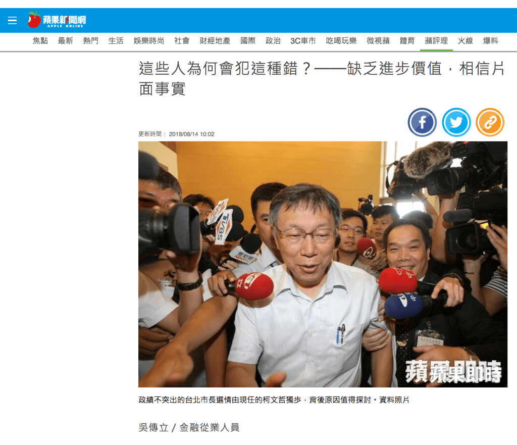 回到文章的開頭:為什麼中華台北人會犯下這種錯?竊以為答案可以用十二個字總括—「缺乏進步價值,相信片面事實」。又或者說,中華台北人的主流價值,其實是「憑什麼要和大陸對抗」、「民主不能當飯吃」、「台灣就是太亂了」、「犯罪的畜牲憑什麼享有人權」等種種服膺強者、崇拜威權、否定人權的價值觀。