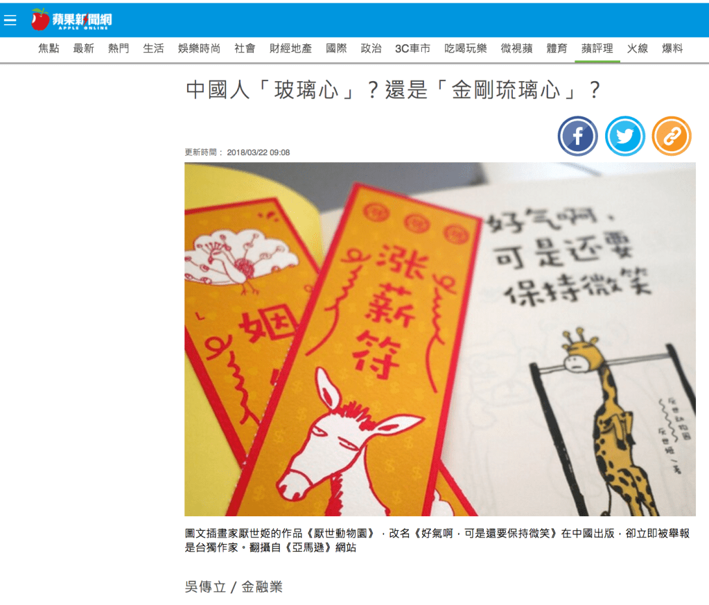 昨天的熱門新聞是:台灣的《厭世動物園》一書就因為「疑似」主張台獨而被中國下架了。中國網民檢舉的理由疑似是因為「堅持用『中國』而不用『大陸』,就是台獨」。