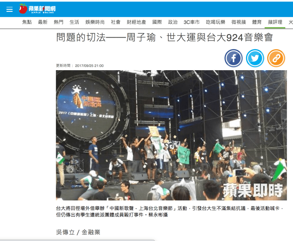 果然,台大音樂會事件之後,網路風向除了譴責暴力打人外,就是一片「台大學生爭取受教權」的呼嘯,要不然就是「憑甚麼中國來辦演唱會竟然破壞數千萬的田徑跑道」,總之都是「替學生、跑道爭取公道」──哦,那麼如果這樣的活動在暑假期間原封不動地搬進台大體育館,就沒有問題了嗎?