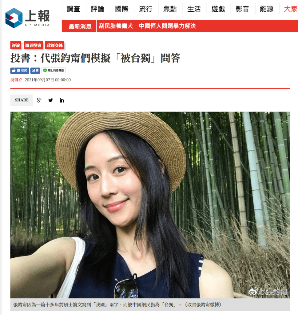 外有超高顏值、內有強大演技的知名藝人張鈞甯近日成了話題人物,原因是因為十多年前張小姐的一篇碩士論文「我國演藝人員經紀管理之法制問題」內的「我國」兩字而被中國的網友起底,於是有了「台獨」或是「被台獨」的討論。