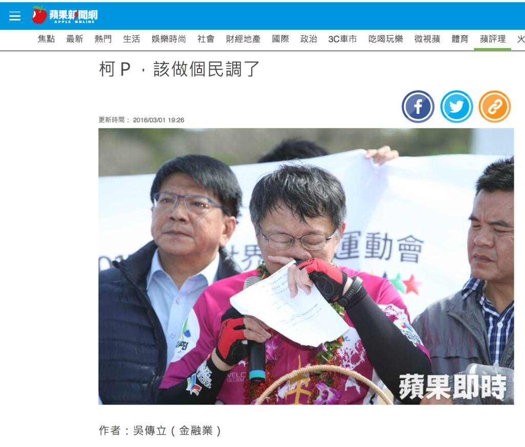 當然,以上只是筆者的主觀觀察、未經科學民調驗證。呼應中國領導大喊「兩岸一家親」、在大選黃金週一日雙城「非典型輔選」的柯市長如果志在千里,或許該是找民調公司談談的時候了。