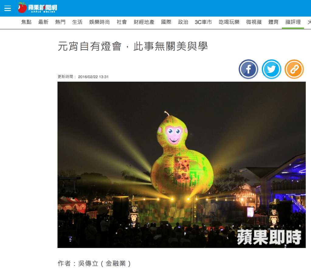 元宵節吃湯圓就是又長了一歲;今年,我還長了點智慧喲!我體會到:美學這種東西呢,本來就只是用來製造話題用的;所謂的「城市美學」,重點在於「行銷城市」,不在於「提昇美學」;只要能行銷城市、只要花燈有民眾觀賞,美學與否哪裡重要?