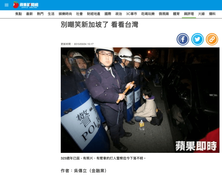 台灣呢? 323週年已屆,因示威抗議遭警察毆打的周榮宗老先生已逝,有照片、有臂章的打人警察迄今下落不明;行政院發言人孫立群與前警政署署長王卓鈞左一句「找不到」、右一句「我能力不太好」,推得一乾二淨,下令限時驅離抗議民眾、把暴力流血驅離淡化成「拍肩」的前行政院長江宜樺則是由馬總統親自別上一等景星勳章。