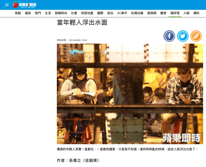 昨天,臉書朋友的朋友貼了一段話,於是我忽然了解了:厲害的年輕人其實一直都在、一直都很厲害,只是我不知道。當時局夠亂的時候,這些人就浮出水面了。太陽花運動中那些鎂光燈下條理分明、有膽有識的學生,其實不過就是這麼一小撮。還有更多一樣優秀、一樣有行動力的人,隱身在鎂光燈之外。