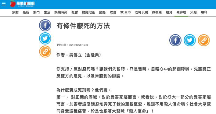 好了。圖窮匕現。除非有誰能夠補充另外的論述說服我改變立場。否則,目前為止,基於以上的思考,目前我個人傾向於「有條件廢死」,比如說,「死刑犯之槍決應由被害者親屬會議指定之親屬執行,並經執行人同意,否則不得執行」。