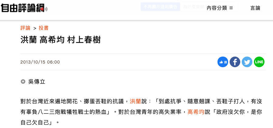 對於台灣近來遍地開花、擲蛋丟鞋的抗議,洪蘭說:「到處抗爭、隨意翹課、丟鞋子打人,有沒有辜負八二三炮戰犧牲戰士的熱血」。對於台灣青年的高失業率,高希均說「政府沒欠你,是你自己欠自己」。