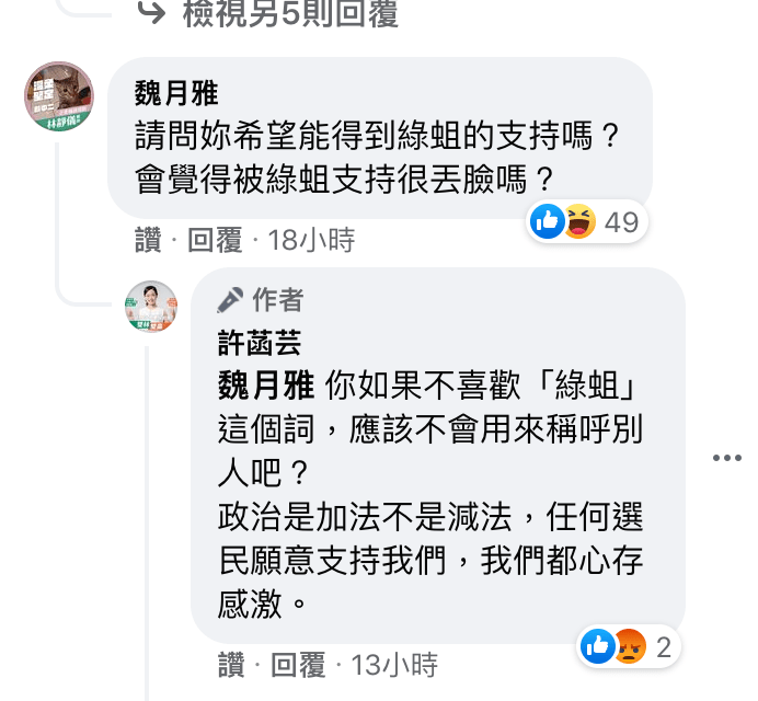 當然啦,如果你像上面這樣說,一定還是會有很多人接著往下提出更尖銳的問題,比如說「為什麼對於柯文哲的大巨蛋就是苦無證據,對於台派就是XXX?」然後你依舊還是會很難招架。但是,那至少比你現在面對「你需不需要綠蛆支持」的質疑時,說出「如果你不喜歡『綠蛆』,應該不會用來稱呼別人吧」這樣完全沒有回應「到底要不要所謂綠蛆的支持」這個問題本身來得好一點吧?