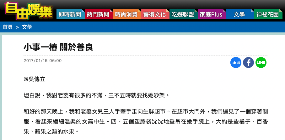 和好的那天晚上,我和老婆女兒三人手牽手走向生鮮超市。在超市大門外,我們遇見了一個穿著制服、看起來纖細溫柔的女高中生。四、五個塑膠袋沈沈地垂吊在她手腕上,大約是些橘子、百香果、蘋果之類的水果。