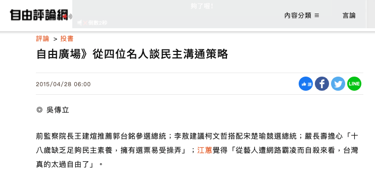 如果要說王建煊、李敖、嚴長壽、江蕙這四人通通都是心懷不軌的政治騙子、一心把台灣打造為獨裁者的天堂、陷黎民蒼生於水深火熱,未免讓人啼笑皆非。但是這些主張、思想,搭配他們的社會能見度與實質影響力,卻又一定程度地影響了許多人的政治判斷,讓台灣人民的思想土壤越來越適合專制政權的滋長。
