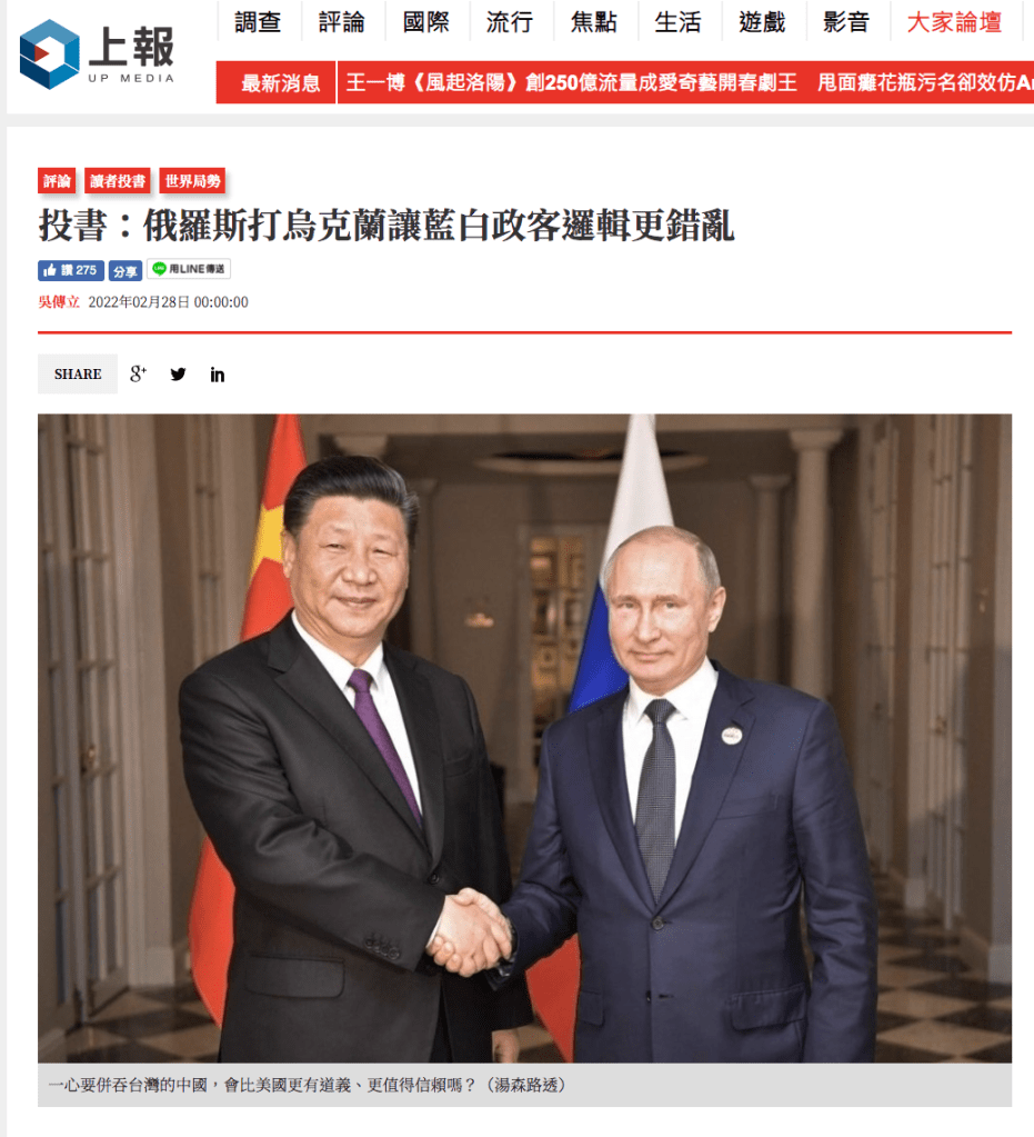 可是,台灣人有在看嗎?從什麼角度看?得出了什麼結論?台灣人的結論是「戰爭很可怕」、「和平很重要」、「美國不可信」、「國際間只有利益沒有正義」以及「為什麼要刺激中國」,然後繼續投票給主張九二共識的中國國民黨、或是投票給「兩岸一家親」、「統獨假議題」的白色力量,更不會想要去批判那些民進黨內高喊「台灣應該永久中立」的邏輯錯亂人士。
