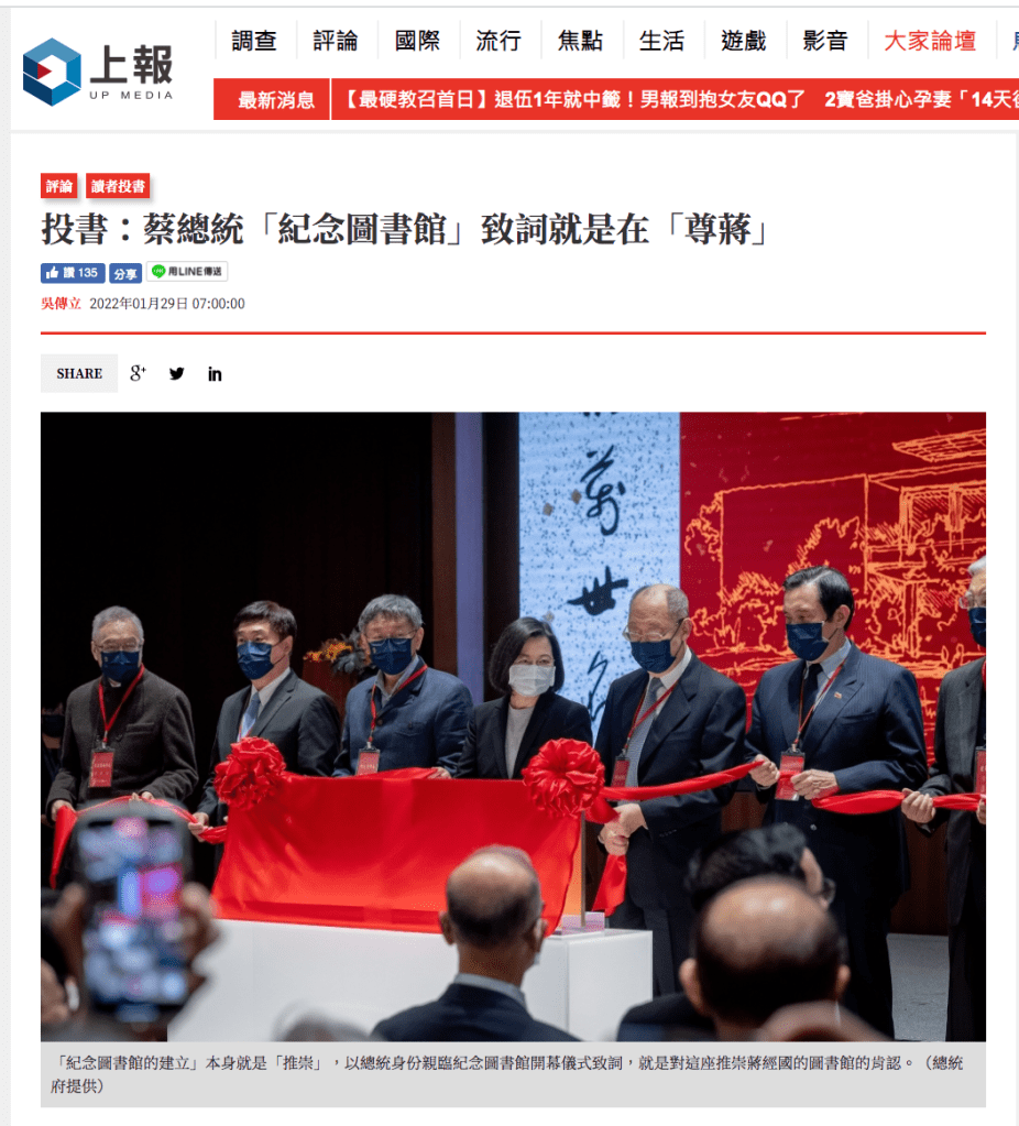 一、「紀念圖書館的建立」,本身就是「推崇」;以總統的身份親臨紀念圖書館的開幕儀式致詞,就是對於這座「座落於經國七海文化園區,推崇蔣經國的圖書館」的肯認。這是無可辯駁的基本社會常識ABC。