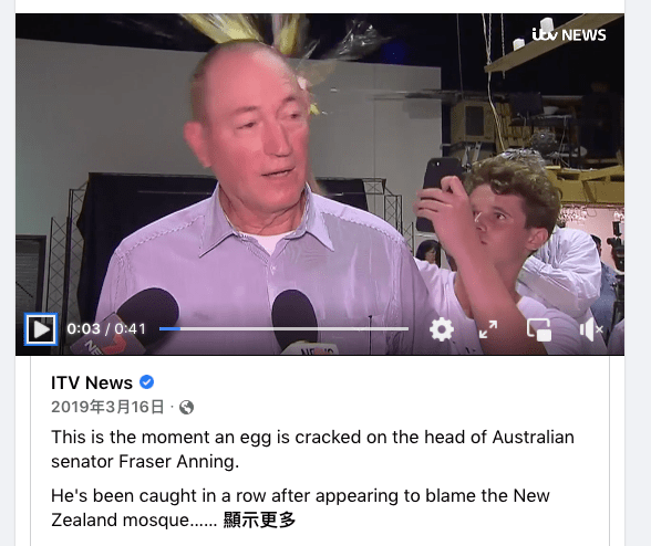 紐西蘭發生白人屠殺穆斯林的悲劇,澳洲有個參議員說這當然該怪罪那些移民來的穆斯林。有個十七歲的少年在議員頭上打蛋,議員立刻揮拳反擊,而十七歲的少年則是被立刻旁人撲倒。