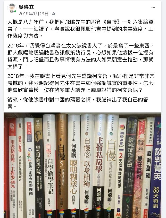 我又想起了我三年前的那篇貼文。當時我就對於著名出版人何飛鵬先生如此青睞柯文哲先生感到百思不得其解。