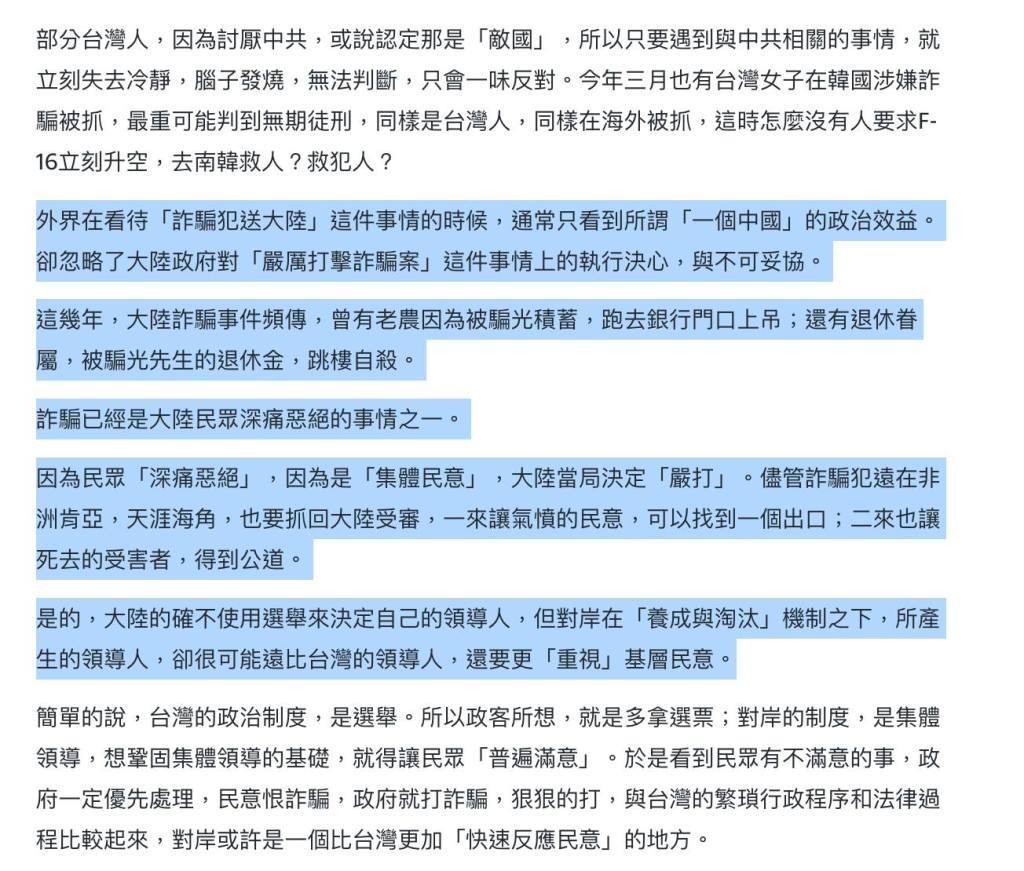 外界在看待「詐騙犯送大陸」這件事情的時候,通常只看到所謂「一個中國」的政治效益。卻忽略了大陸政府對「嚴厲打擊詐騙案」這件事情上的執行決心,與不可妥協。