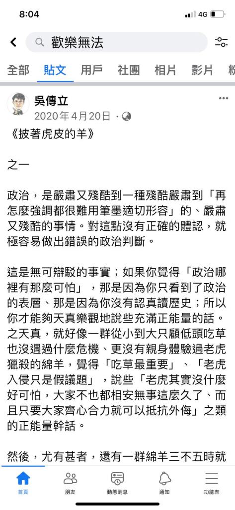 這是無可辯駁的事實;如果你覺得「政治哪裡有那麼可怕」,那是因為你只看到了政治的表層、那是因為你沒有認真讀歷史;所以你才能夠天真樂觀地說些充滿正能量的話。之天真,就好像一群從小到大只顧低頭吃草也沒遇過什麼危機、更沒有親身體驗過老虎獵殺的綿羊,覺得「吃草最重要」、「老虎入侵只是假議題」,說些「老虎其實沒什麼好可怕,大家不也都相安無事這麼久了、而且只要大家齊心合力就可以抵抗外侮」之類的正能量幹話。
