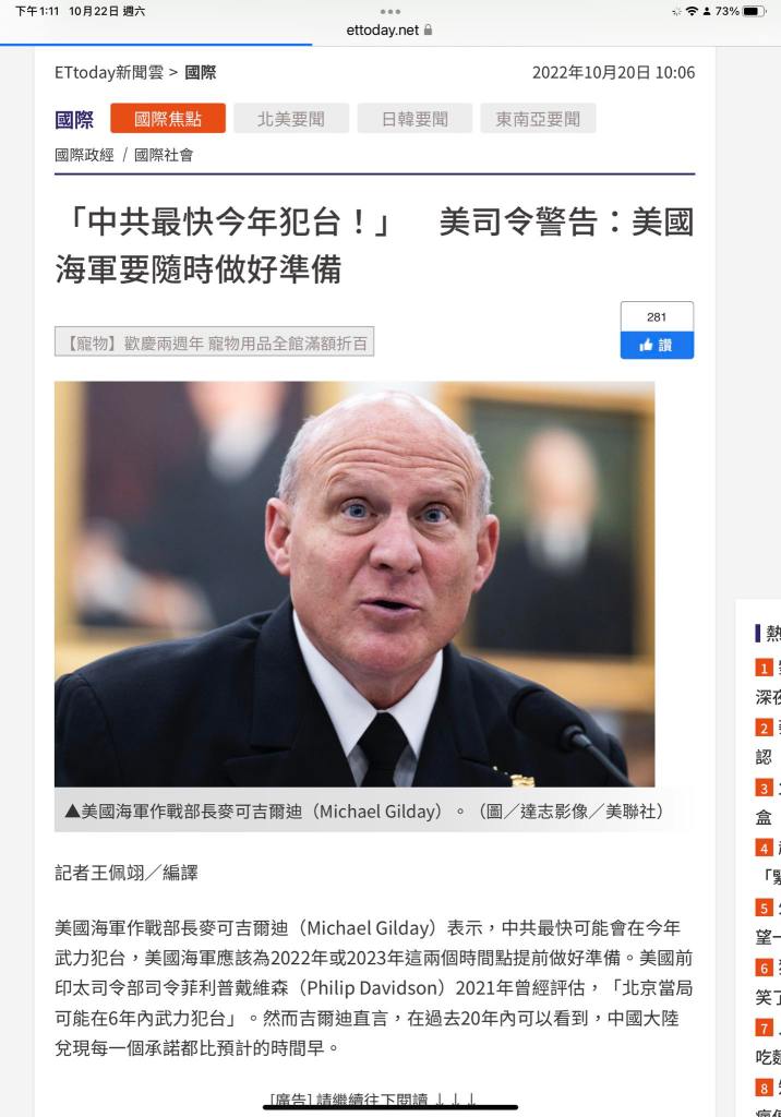 不只一次提到中國可能會對台灣發動攻擊