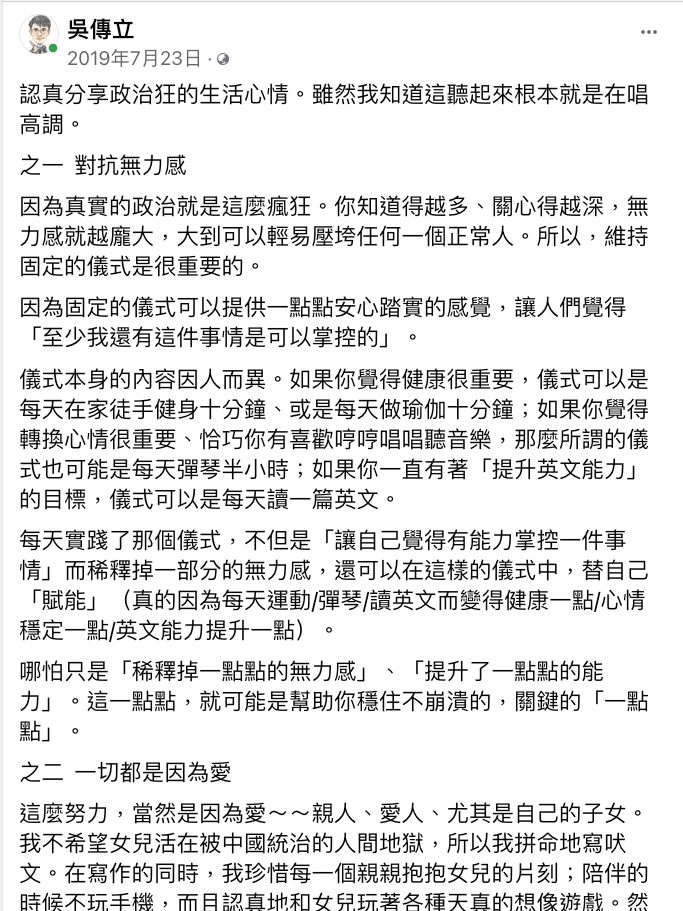 這麼努力,當然是因為愛~~親人、愛人、尤其是自己的子女。我不希望女兒活在被中國統治的人間地獄,所以我拼命地寫吠文。在寫作的同時,我珍惜每一個親親抱抱女兒的片刻;陪伴的時候不玩手機,而且認真地和女兒玩著各種天真的想像遊戲。然後,把這種幸福的感覺深刻地刻進記憶裡。