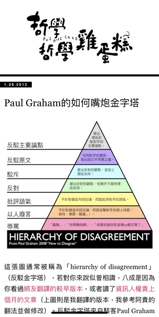 差不多就是這樣子了。最後就是忍不住要提醒一下:留言前可以對照一下「嘴砲金字塔」,看看自己的留言在哪一階/確認一下自己打算要在網路上展現怎樣的形象。