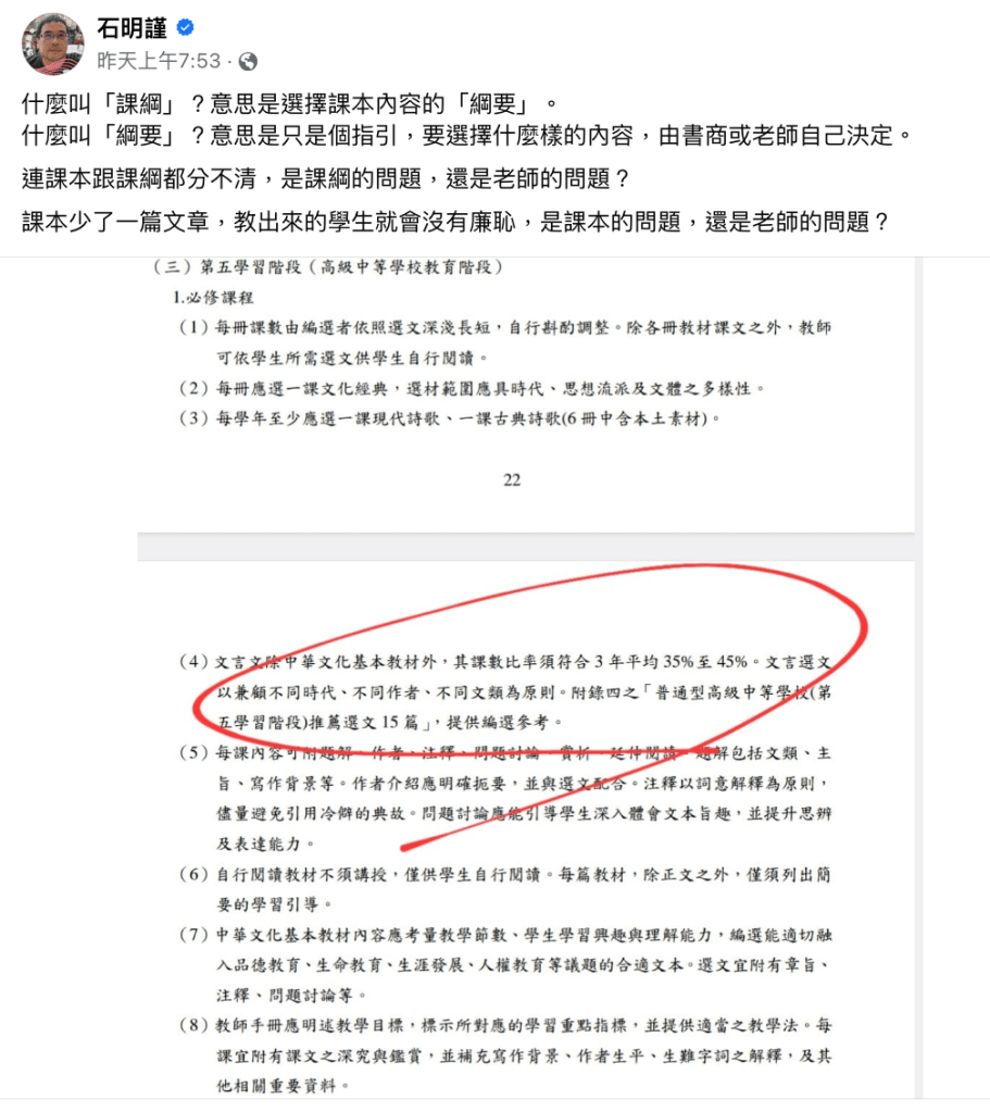 3.有沒有人禁止文言文?完全沒有。進一步說,現在也不是三十年前國立編譯館的年代;課綱只是「鼓勵讀哪幾篇文言文」以及「多讀幾篇白話文」,完全沒有「禁止老師教/學生讀文言文」。