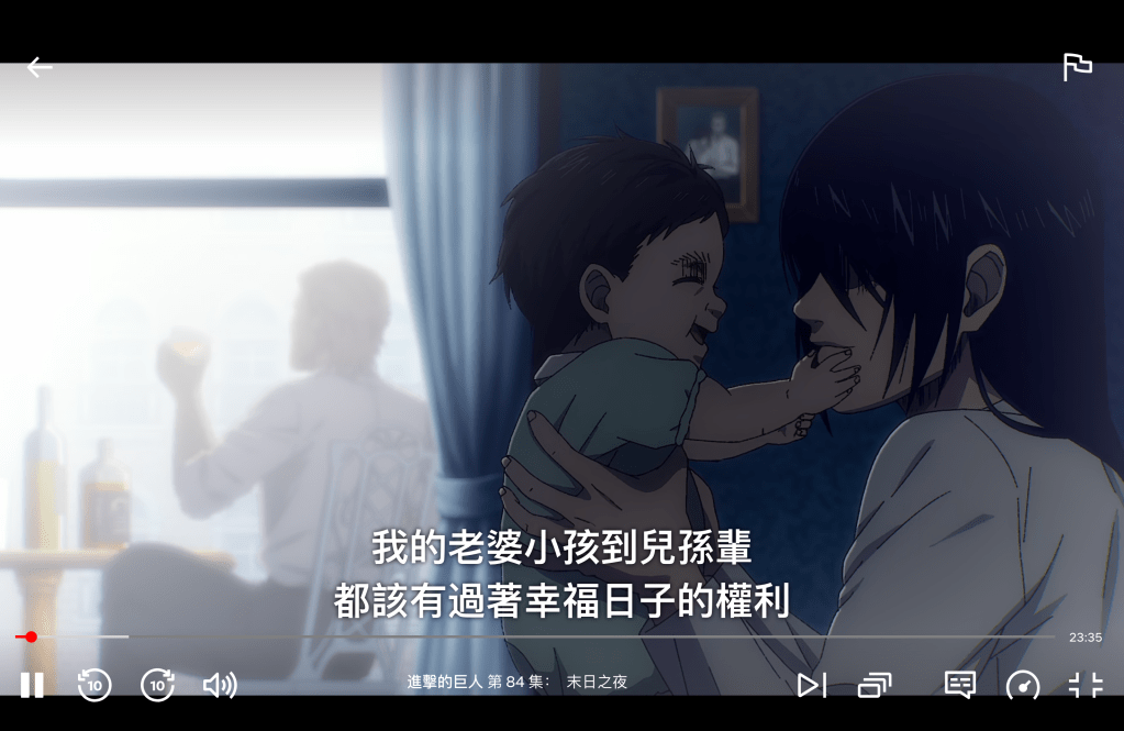 圖說:《進擊的巨人》中的一幕;約翰幻想著自己原本就在眼前的爽日子;一個很像是米卡莎的漂亮老婆替約翰生了一個兒子。
