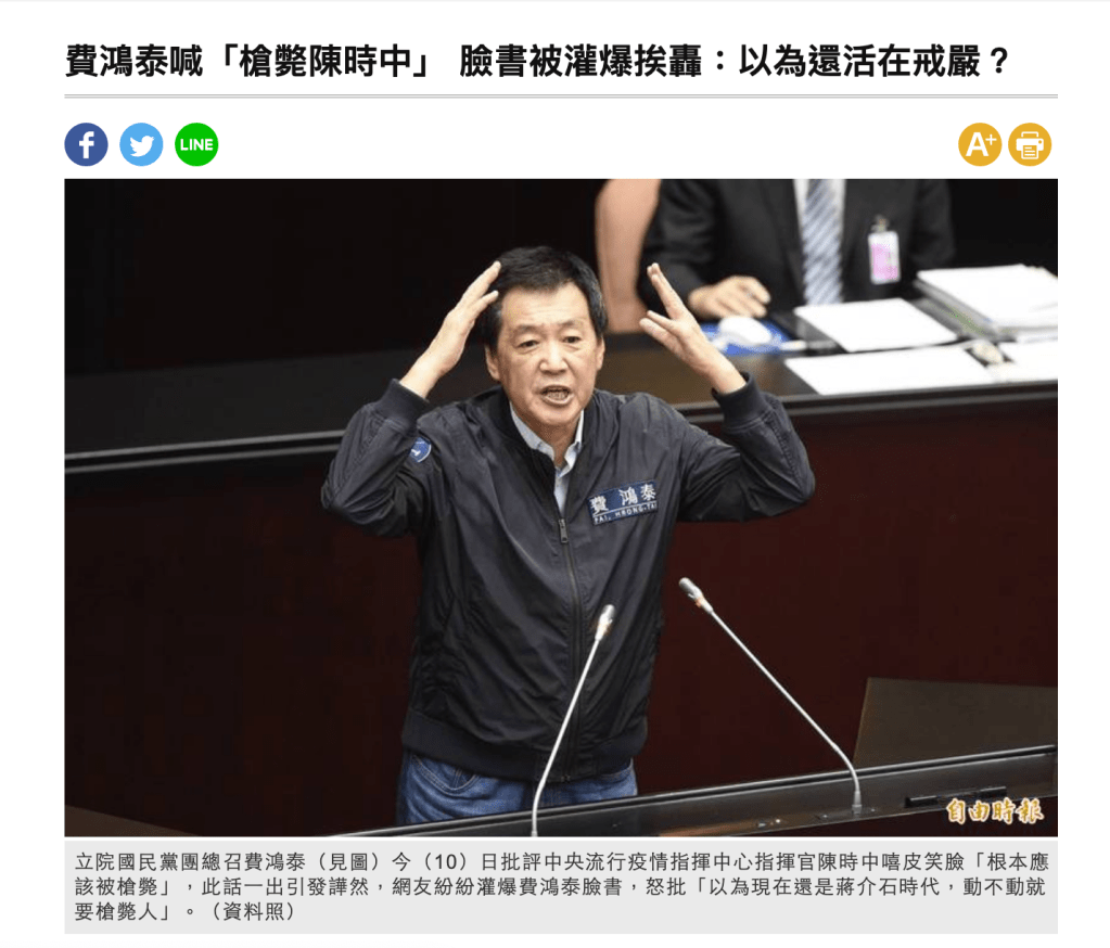 最後的最後,一個在武漢肺炎中居功厥偉、自己卻又從不居功得陳時中部長,被抹黑成什麼樣子?!時任中國國民黨的立院總召費鴻泰甚至批評陳時中「疏於防疫」、喊「槍斃陳時中」???!!!