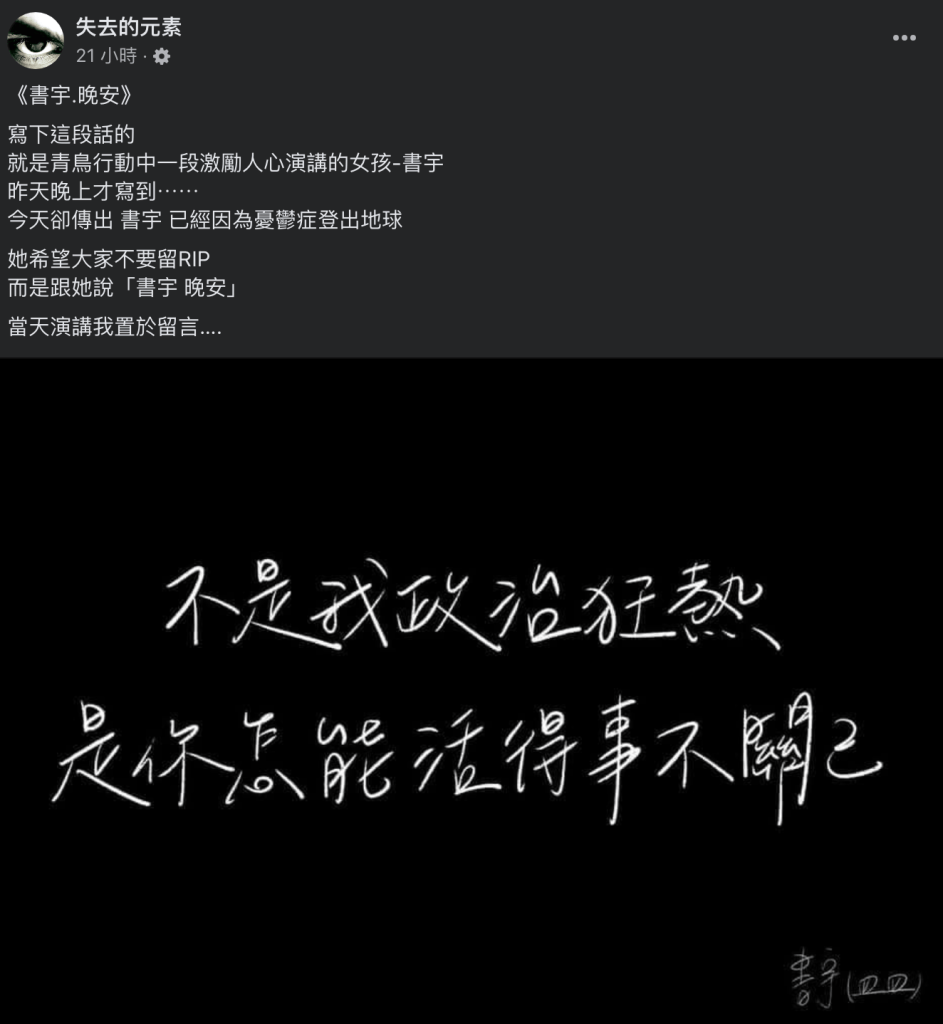 「書宇 晚安」是這兩天在臉書上出現的一則讓我非常感嘆的消息
