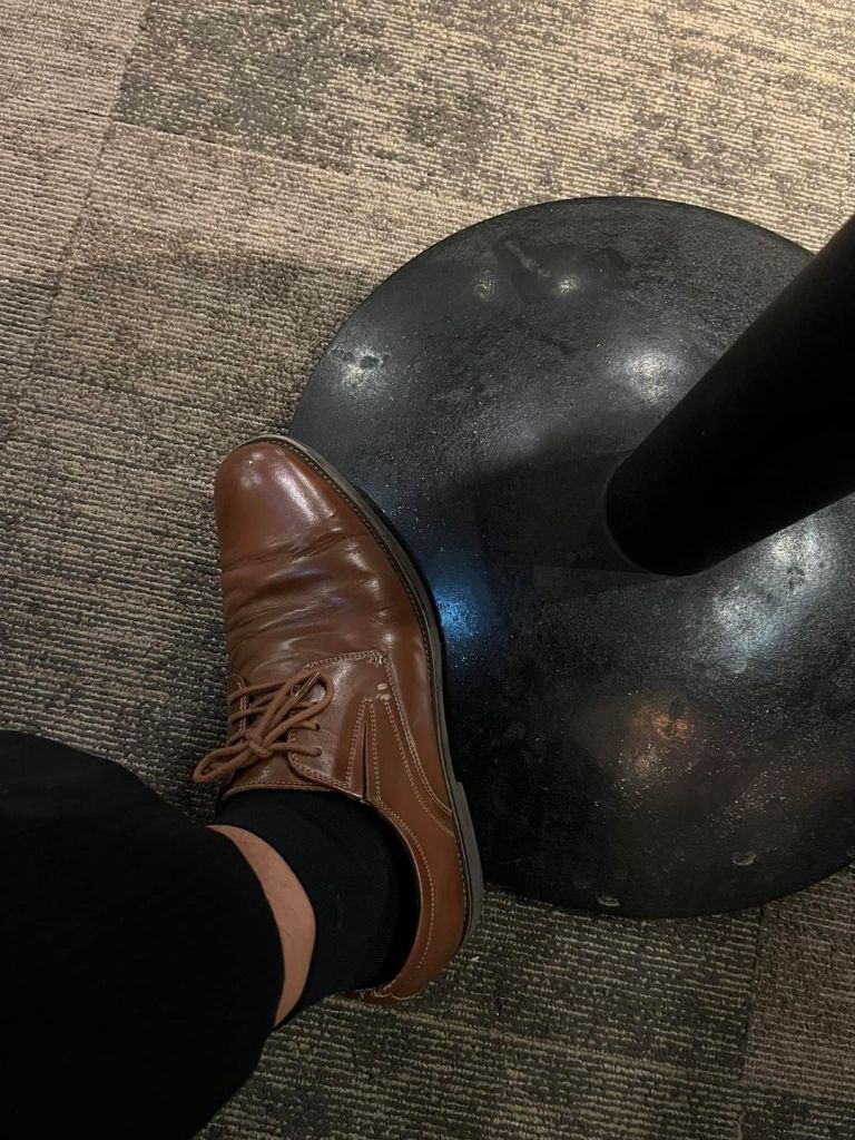 圖說:皮鞋改變了手機的墜落角度,狠狠砸在桌腳。照片係當事皮鞋與當事桌腳