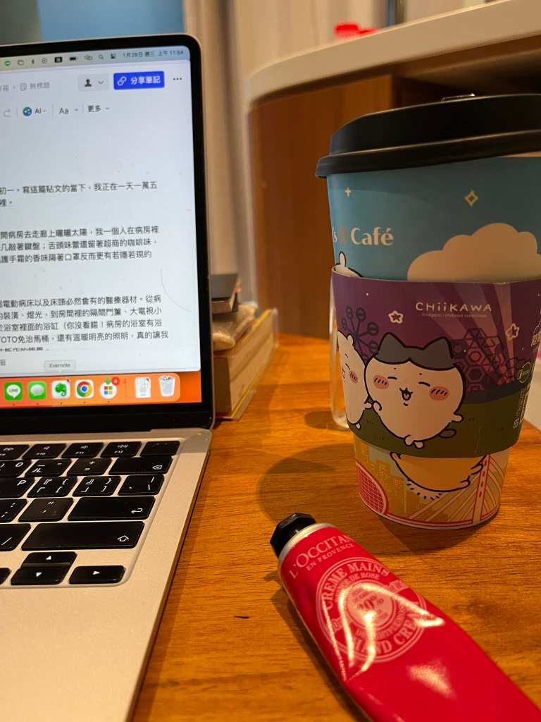 老媽暫時離開病房去走廊上曬曬太陽,我一個人在病房裡的沙發小茶几敲著鍵盤;舌頭味蕾還留著超商的咖啡味,歐蘇丹玫瑰護手霜的香味隔著口罩若隱若現,反而更美好。