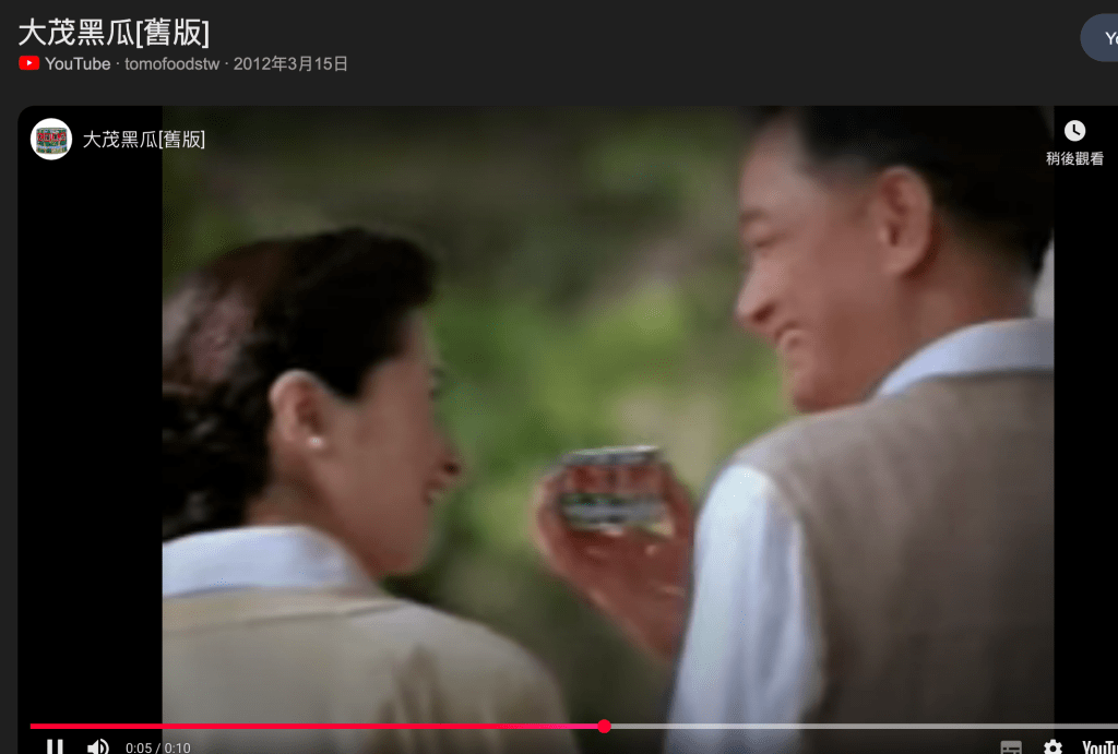 圖說:大茂黑瓜的經典廣告。一對老夫妻牽著手散步聊天,老婆笑咪咪地說「老誒啊!明哪仔吃菜喔!」真的是非常非常深刻的情感素描。