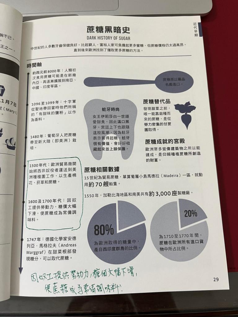 「用腦袋去理解」,理解到的,就是字面上的那些意思。年代、地區、生產、人力、人口販賣、奴隸、蔗糖、供需法則與價格。腦中浮現的畫面,是蔗糖的棉美、是白花花的銀子、是奴工辛苦地採集棉花、種植蔗糖。