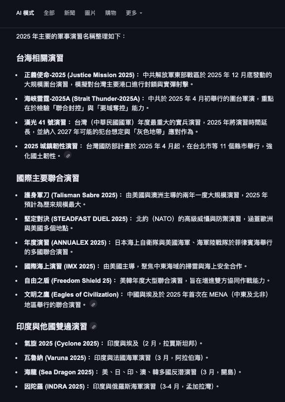 透過AI簡單回顧一下2025年主要的軍事演習名稱,會發現:
