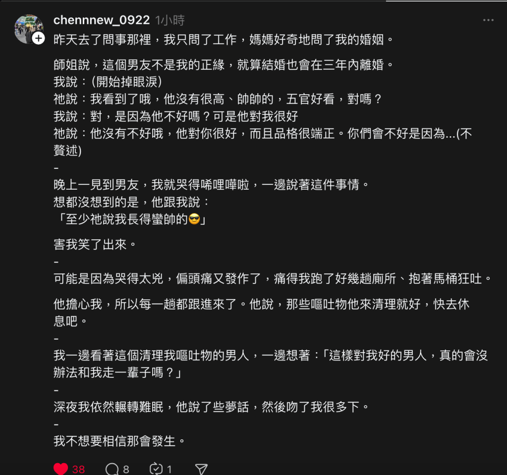 女生聽了超傷心。回家後哭著對男友說這件事。男友溫暖地安慰著女友,還幽默地說「至少祂說我帥」之類的。看起來明明就是一個優質暖男。