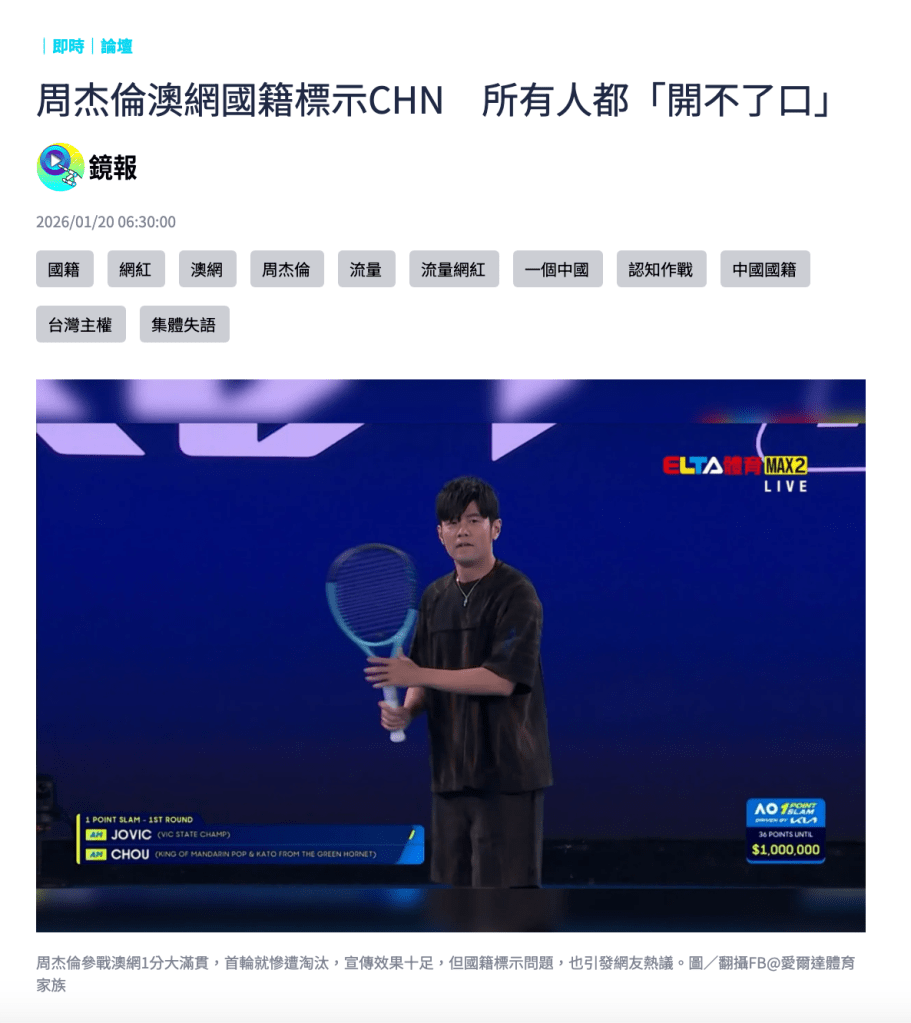 根據媒體一月十四日的報導,周杰倫在「澳網公開賽一分大滿貫」賽程表上,掛的是中國國籍。關於這個事件,網友基於各種立場的各種發言,當然五花八門。