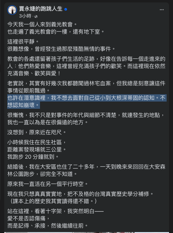 101董事長賈永婕的在臉書上的「驚覺」之後,不只是「驚覺」而已。過了兩天,她來到了義光教會,在臉書的貼文上寫著「也許在潛意識裡,我不想去面對自己從小到大根深蒂固的認知。不想認知崩壞。」