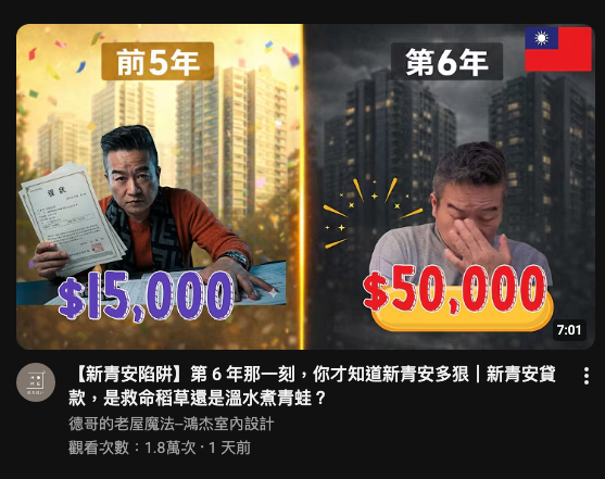 然後到了後半段,又話鋒一轉,說「我不是叫你不要用新青安。工具本身沒有對錯。……我要提醒你的是不要傻傻被推上台桌。你現在簽的不是什麼福利,而是長達四十年的金融對賭。」