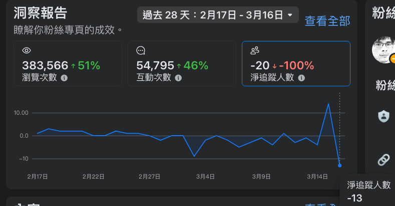 昨天我的某篇貼文轉貼分享討論數忽然多了起來,上面說的那些「激烈留言」也跟著變多。我看了覺得煩,就把那些「激烈留言/無腦留言」「且」「鎖帳號」的帳號封鎖。結果?我前一天增加的追蹤人數,幾乎等於我次日減少的追蹤人數?!