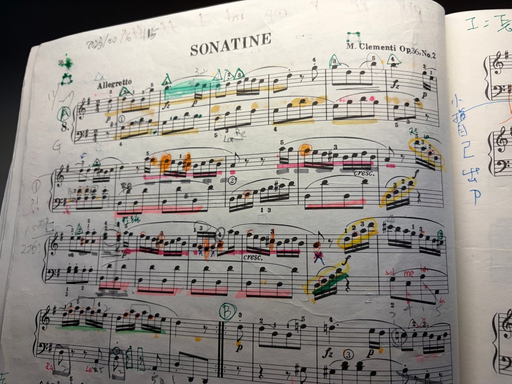 Sonatine M.Clementi Op.36 No.2的第一大段。那短短的一頁又兩行,從第一次練習到現在,已經有三年了。中間雖然經過了九個月的停課,但再怎麼說,都已經是「練了三年了」